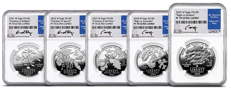 For over two decades, the Platinum American Eagle Proof has celebrated the ideals that define our nation. The 2025 release marks a historic milestone—the fifth and final coin in the U.S. Mint’s First Amendment to the United States Constitution Platinum Proof Coin Series. This groundbreaking collection has honored the freedoms and rights enshrined in the First Amendment, using the growth of an oak tree as a powerful metaphor for the development of liberty in America.